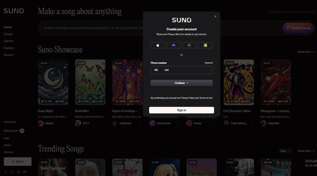 - Sau khi đăng nhập, bạn có thể bắt đầu tạo nhạc ngay (bản miễn phí có giới hạn lượt tạo mỗi ngày)